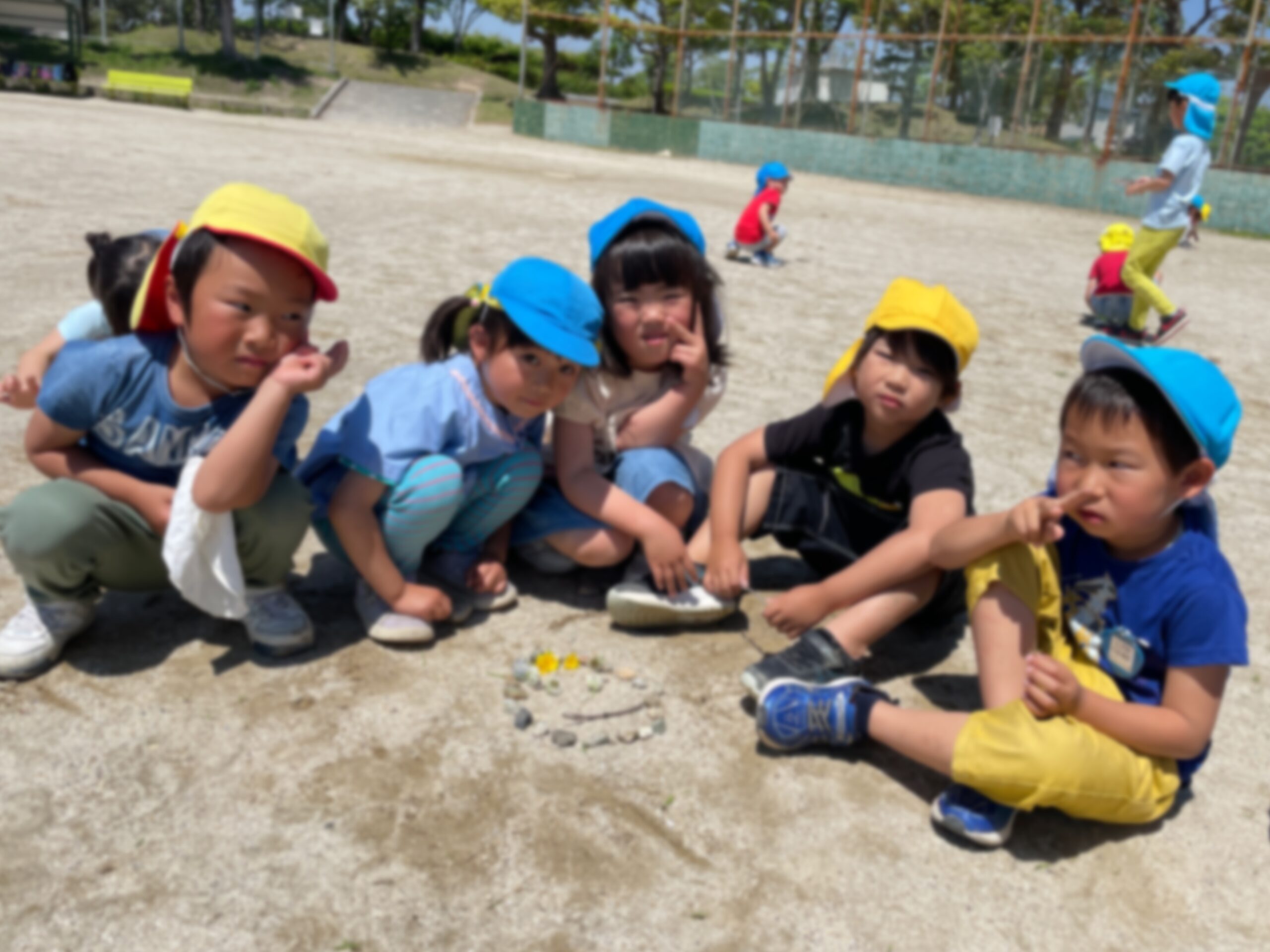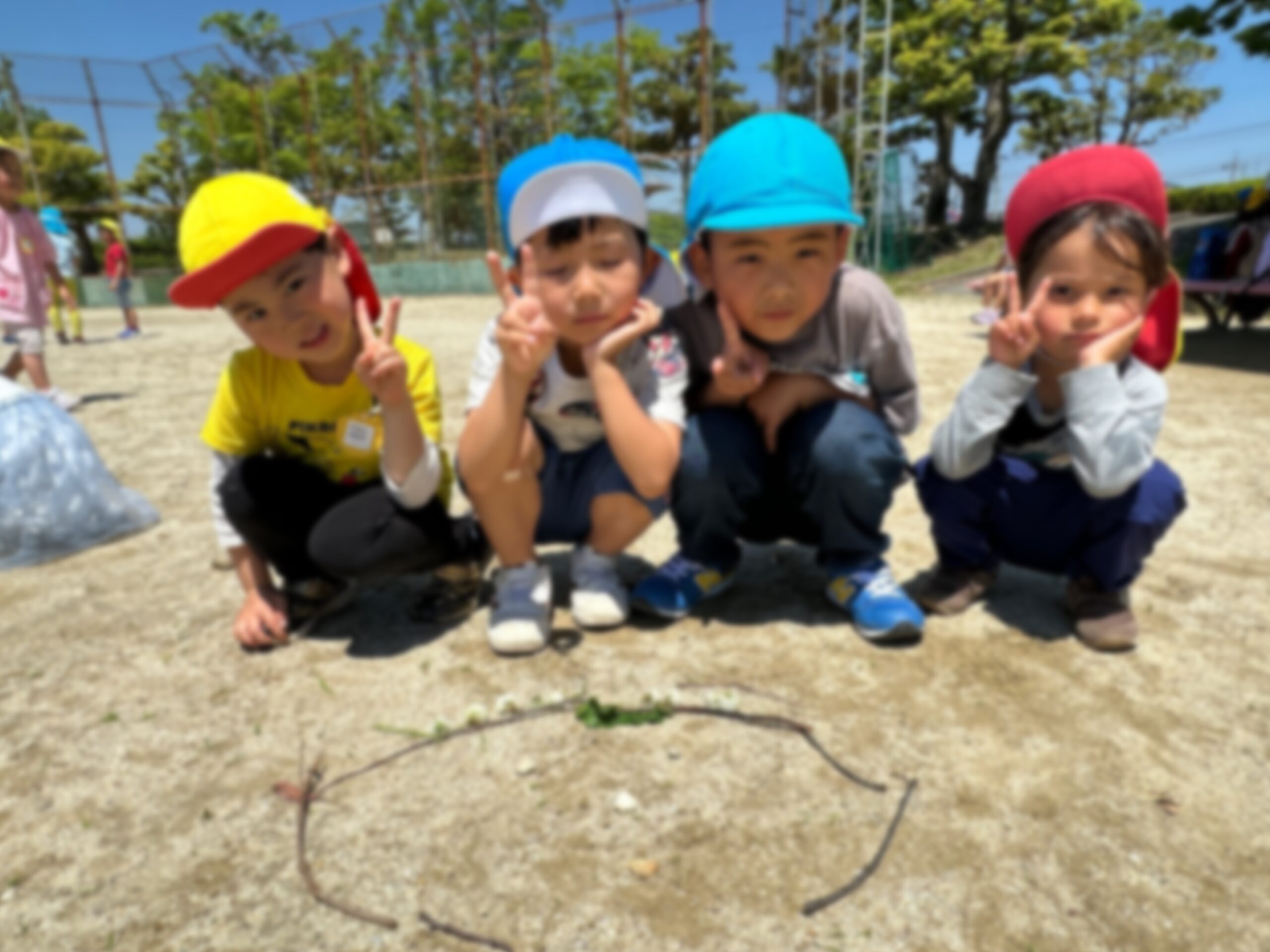 大きなグラウンドでは手を繋いで行った友達と『石を3つ』や『棒を5本』などの指令ゲームをし、それを組み合わせて顔を作ったりするネイチャーゲームも楽しみました!