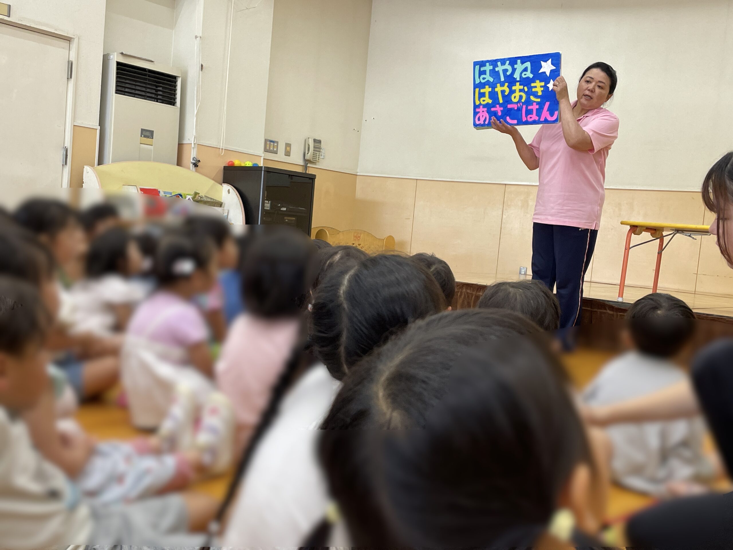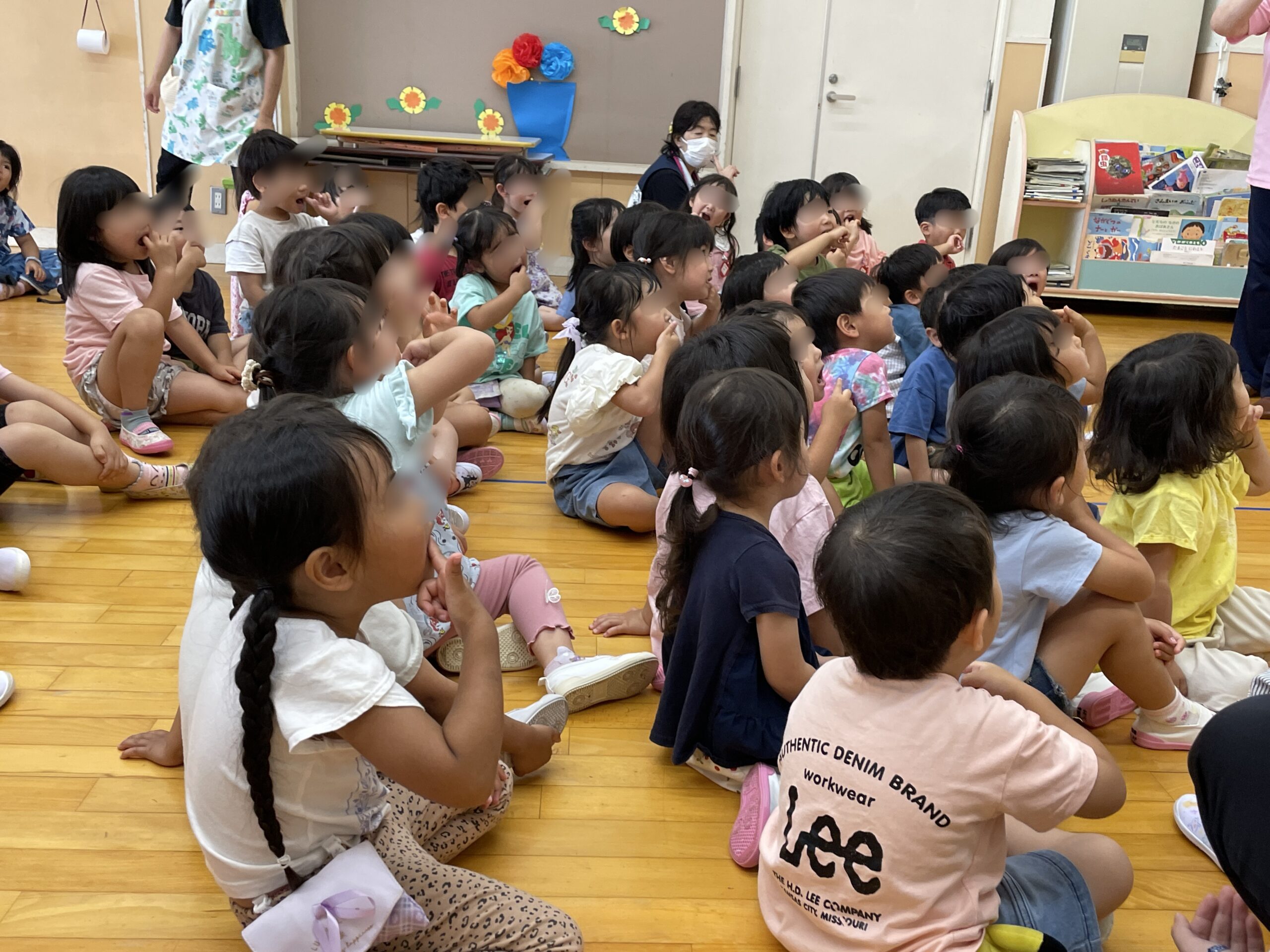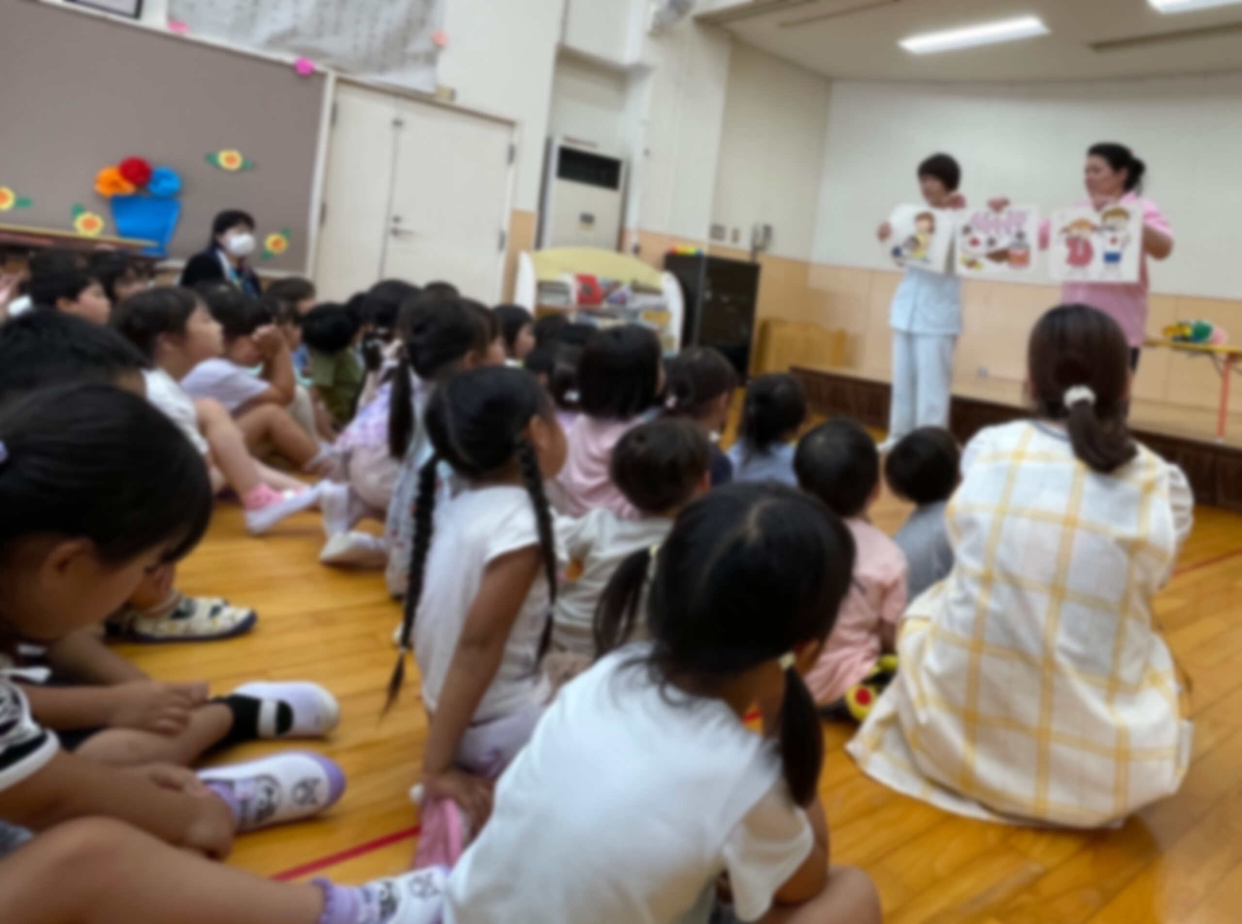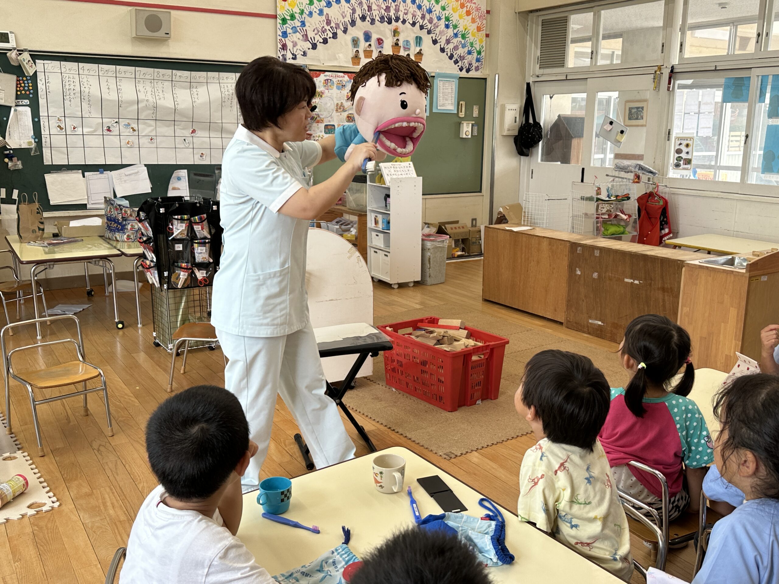 小牧市保健センターより、歯科衛生士さんと栄養士さんをお迎えして『歯磨きの仕方』や『栄養の話』を聞きました!