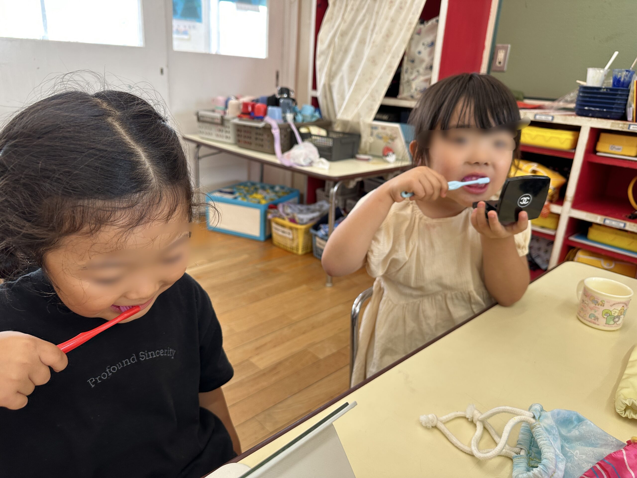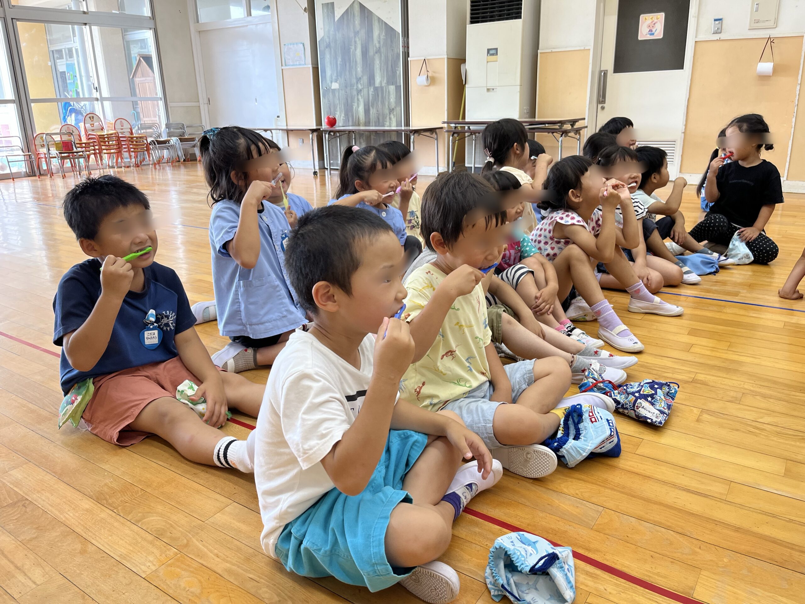 年中・年少組は手で、年長は歯ブラシで磨いてみました!