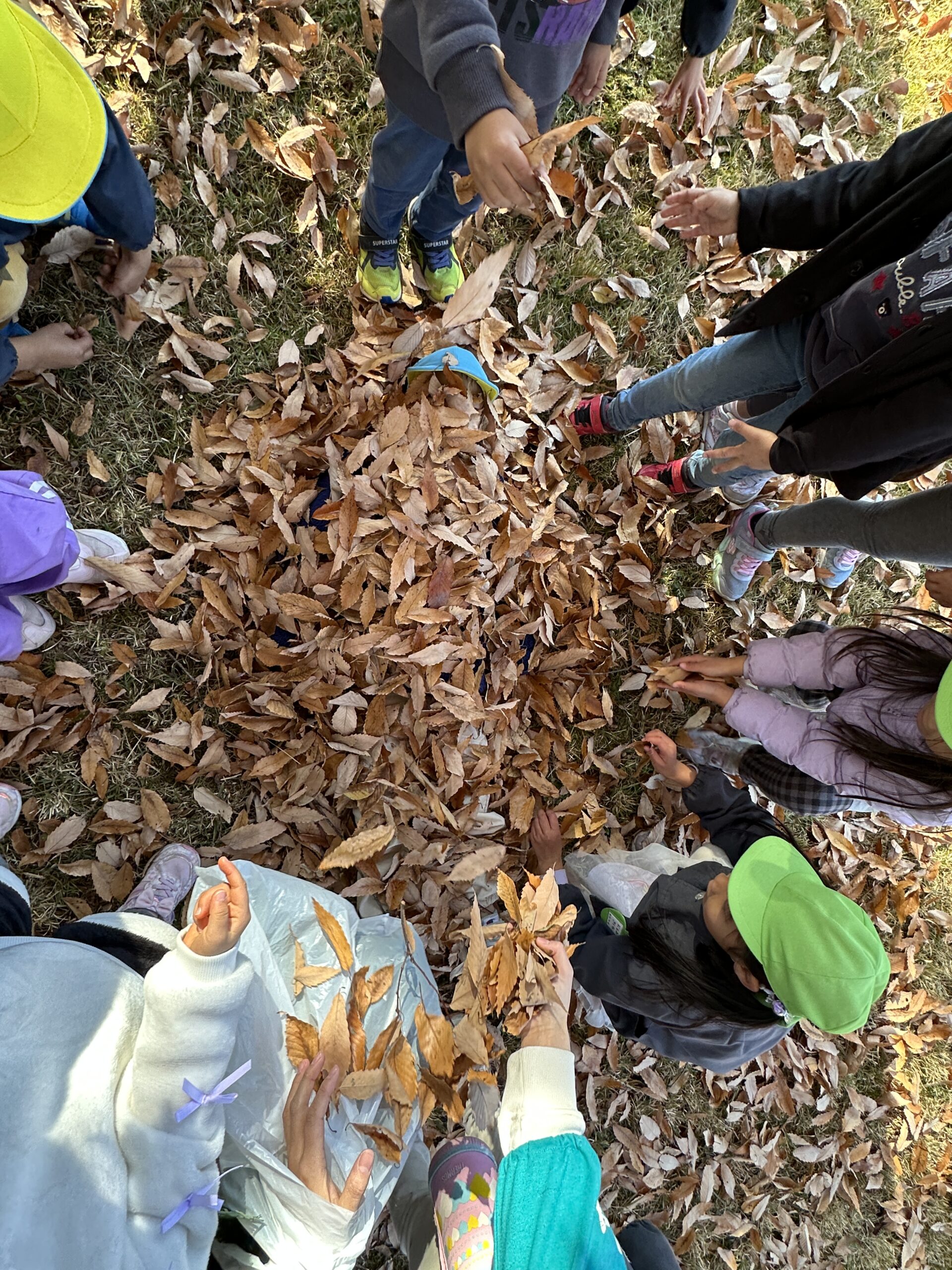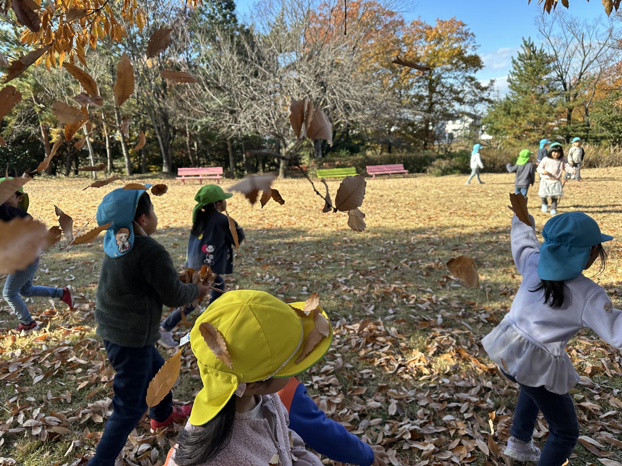 落ち葉がたくさんあり、落ち葉を降らせたり、落ち葉の中に隠れたりして遊びました!