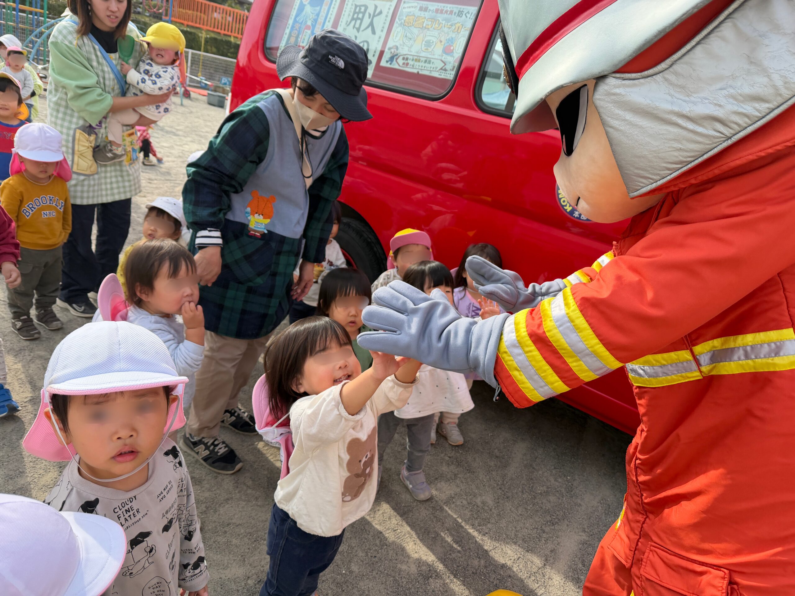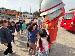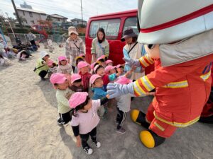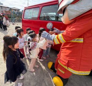 幼児組は帰りに消防署まで行き、消防署の方のお話を聞いたり、消防車や救急車を見せて頂きました。