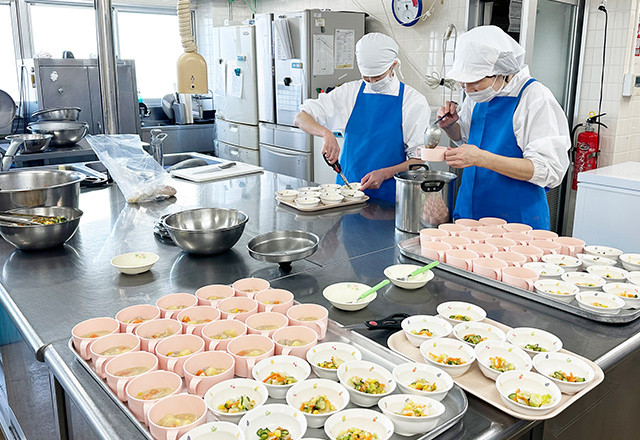 自園調理ならではの美味しい香りが毎朝園内に広がります。管理栄養士の献立のもと、調理員のエ夫をこらした調理で子どもたちは様々な食材を味わうと共に、食への関心を高めます。